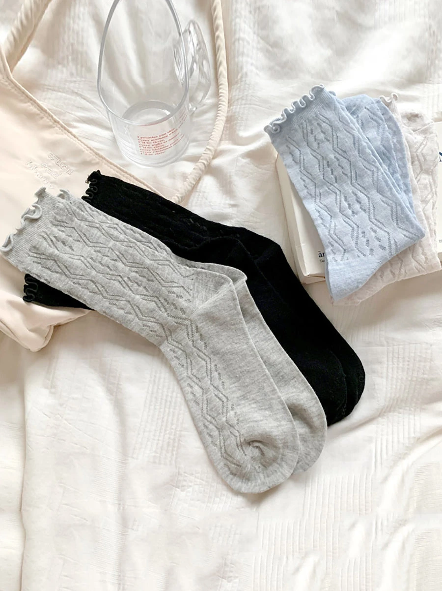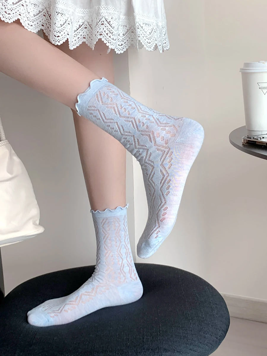 These 5 pairs of women’s summer mid-calf socks (ZZ1007) are beautifully designed with lace trim for added style. The longer length provides comfortable coverage while keeping you cool in warm weather. Perfect for adding a touch of elegance to your summer wardrobe.