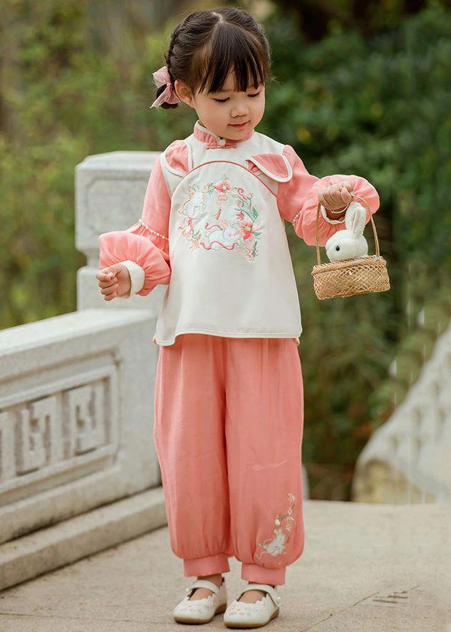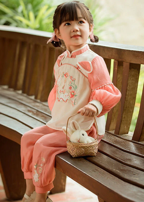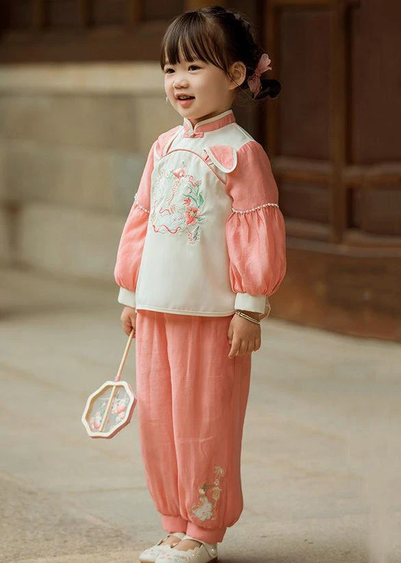 Aqua Red Elastic Waist Patchwork Cotton Girls Two Piece Set Stand Collar Long Sleeve