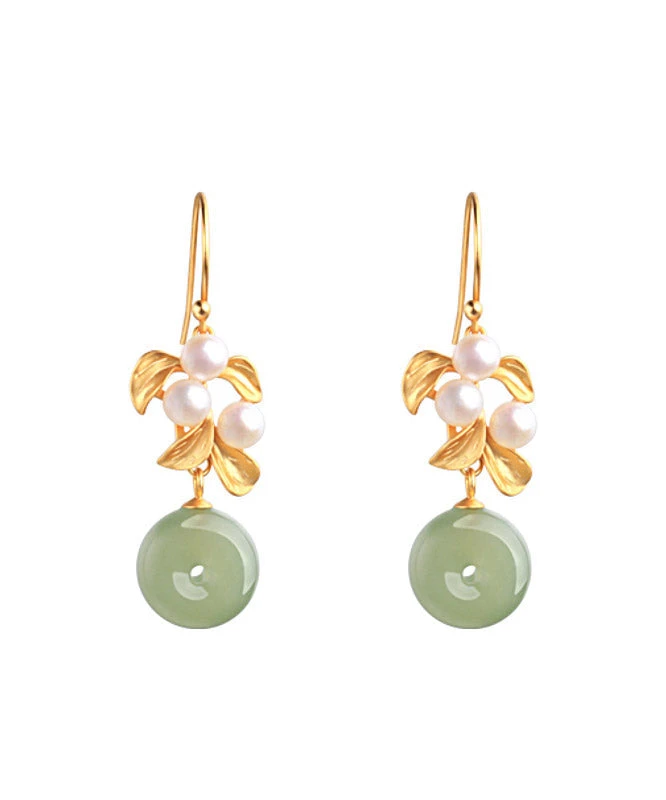 Art Green Sterling Silver Inlaid Jade Pearl Leaf Drop Earrings LY2308