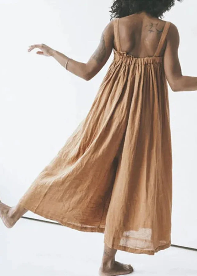 Art Khaki Slash Neck Button Solid Linen Jumpsuit Summer