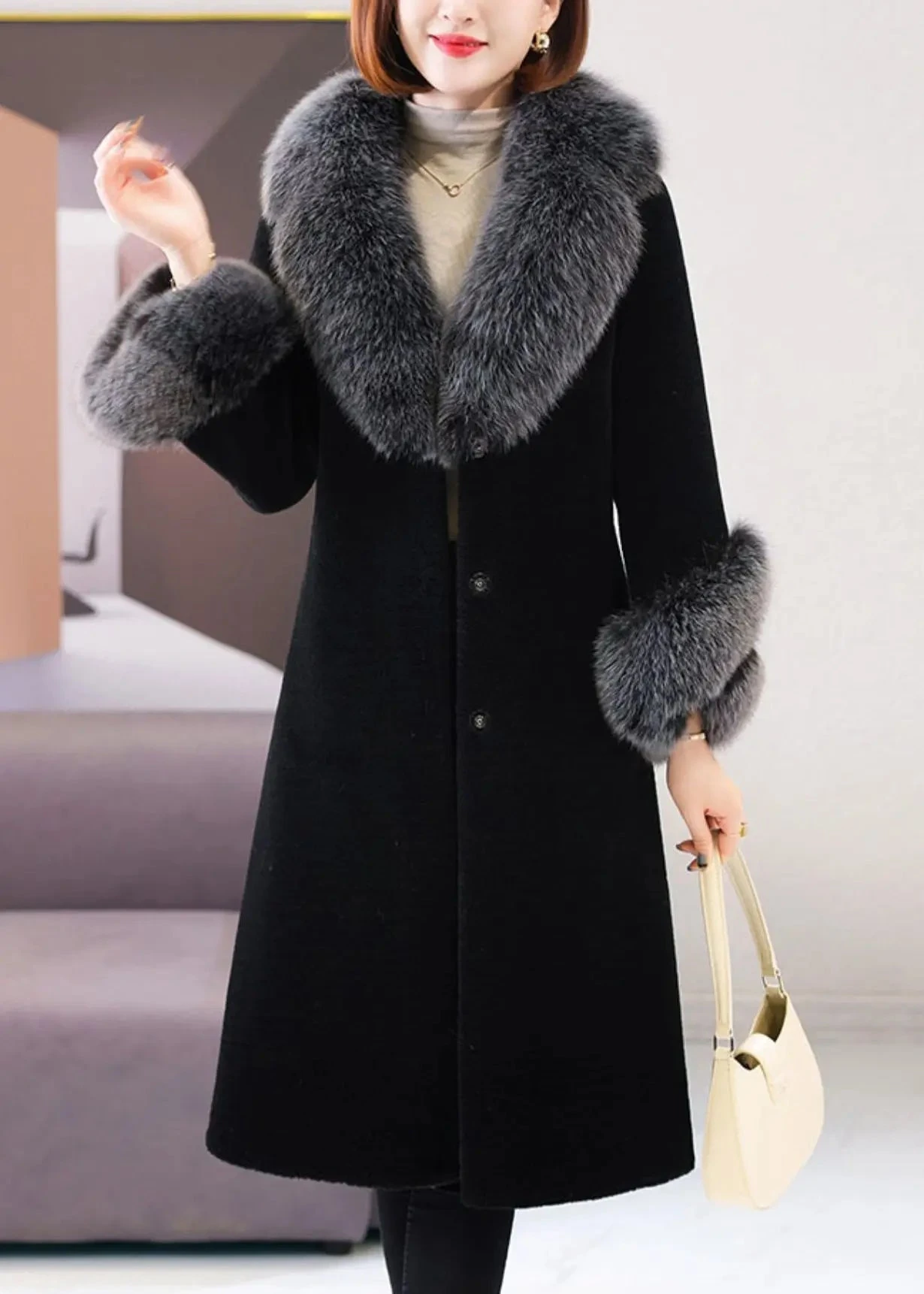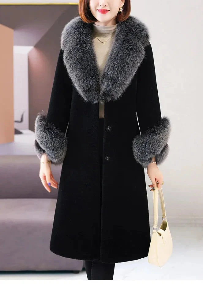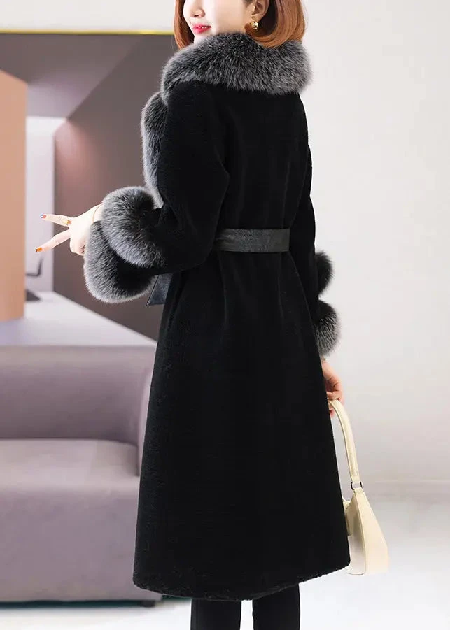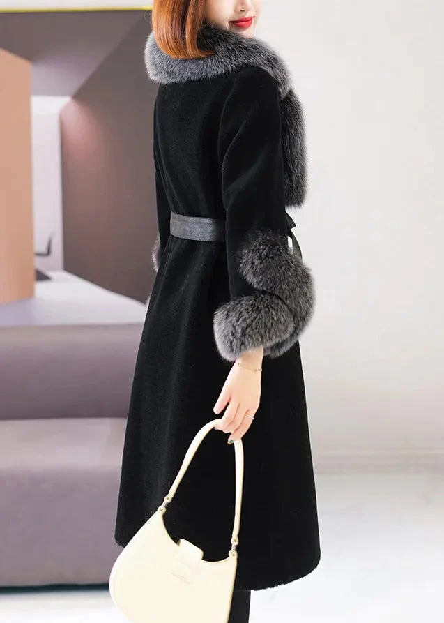 Beautiful Black Fox Collar Tie Waist Woolen Long Coat Winter
