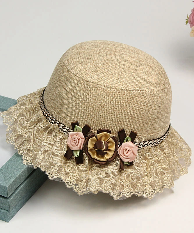 Beautiful Champagne Floral Lace Patchwork Linen Bucket Hat LY508