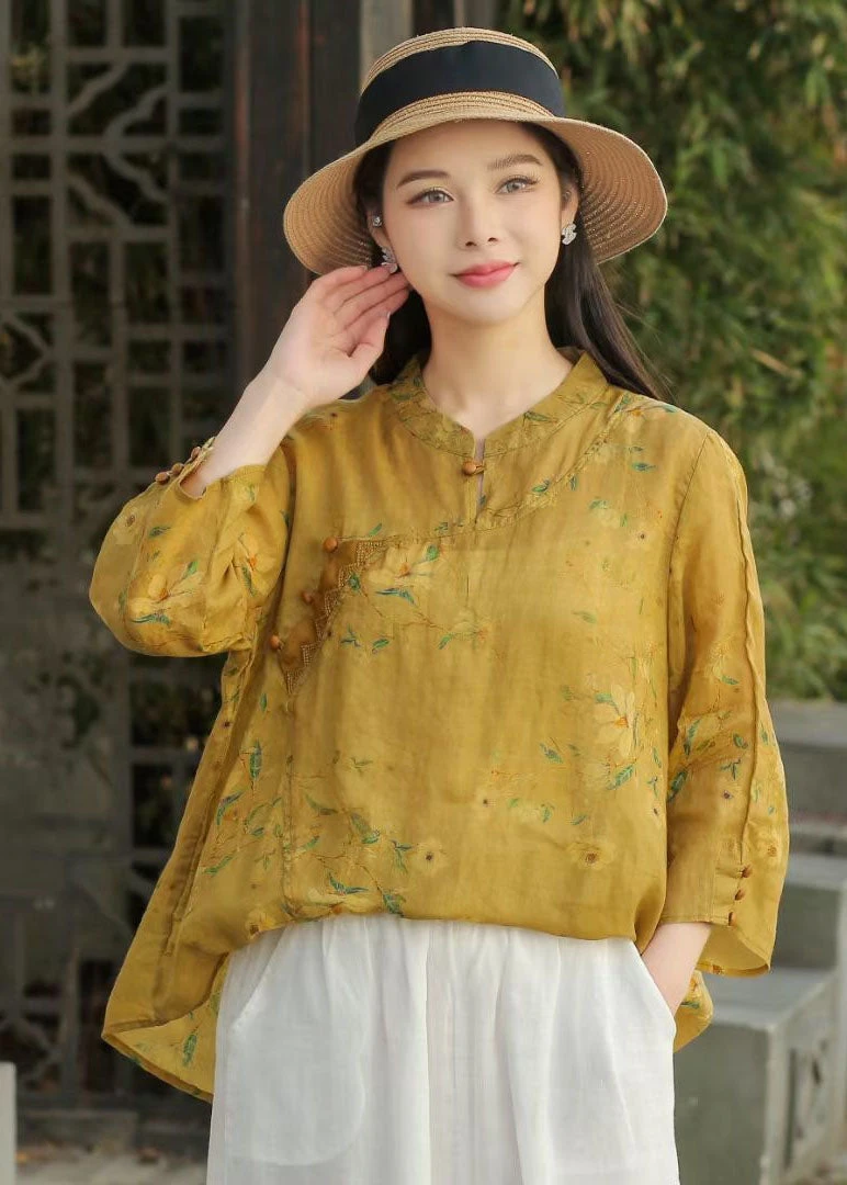 Beautiful Yellow Stand Collar Print Patchwork Linen Blouse Top Spring