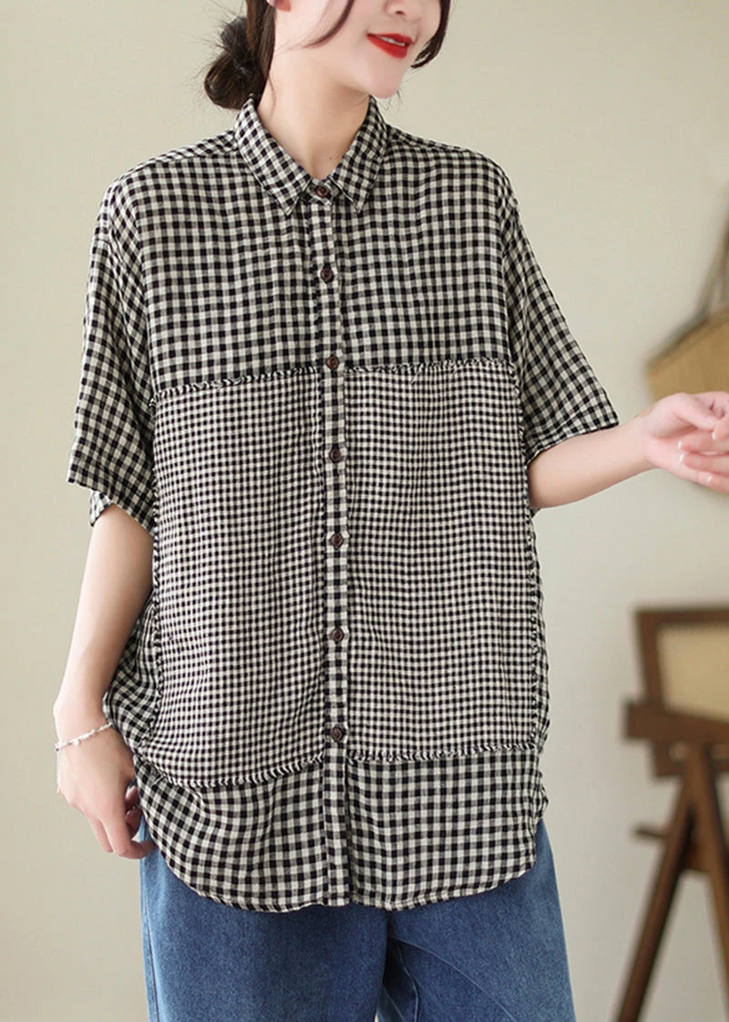 Black Plaid Patchwork Linen Blouse Top Oversized Summer