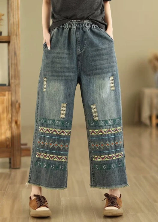 Bohemian Blue Embroidered Pockets Denim Wide Leg Pants Spring QQ1036