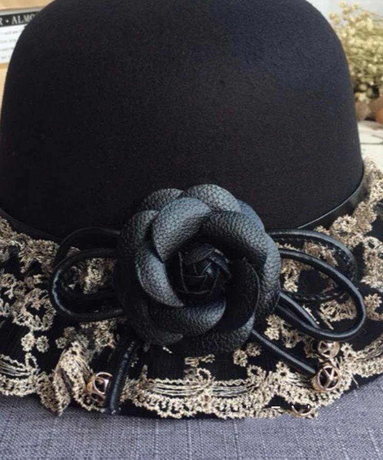 Boho Black Lace Patchwork Floral Woolen Bucket Hat LY541