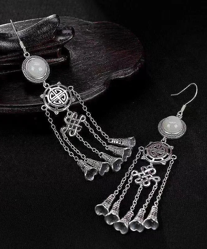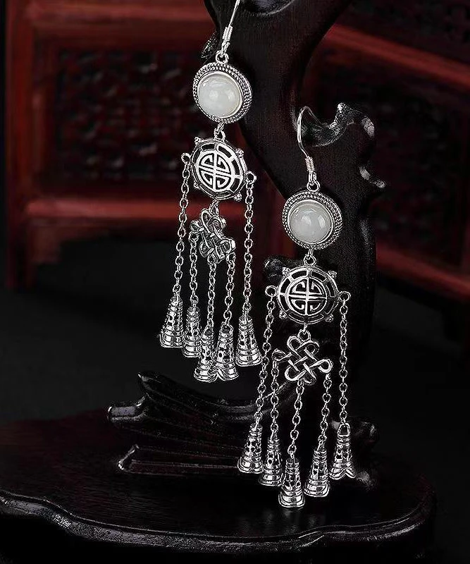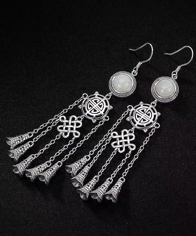 Boho Jade Patchwork Tassel Silver Drop Earrings LY9146