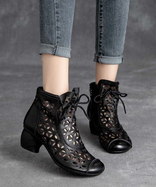 Brown Hollow Out High Heels Chunky Cowhide Leather Fine Lace Up Boots