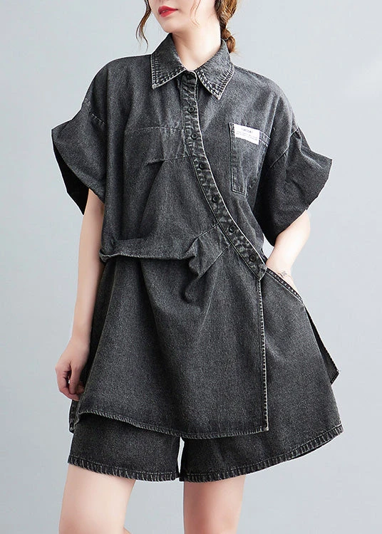 Casual Blue Peter Pan Collar Cotton Shirts And Shorts Two Pieces Set Summer