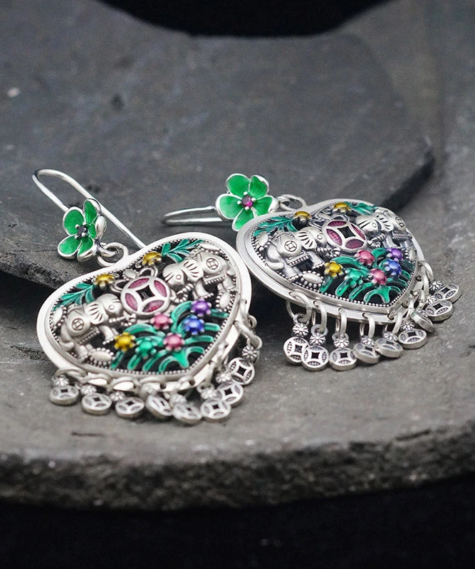 Casual Green Sterling Silver Heart Floral Tassel Drop Earrings