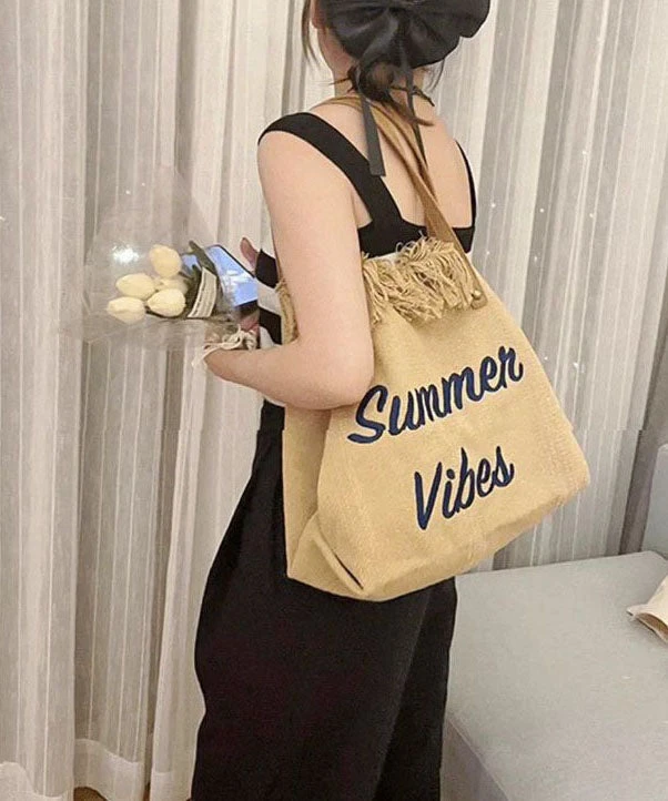 Casual Khaki Tassel Letter Embroidery Canvas Tote Handbag