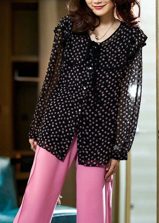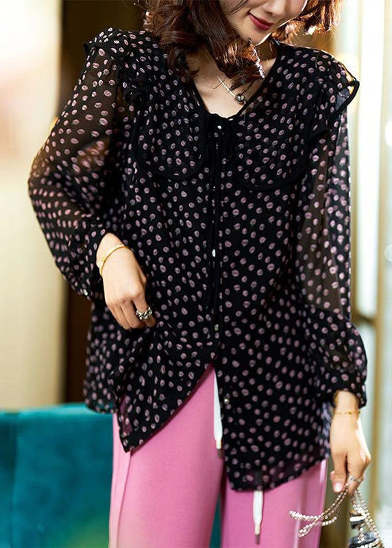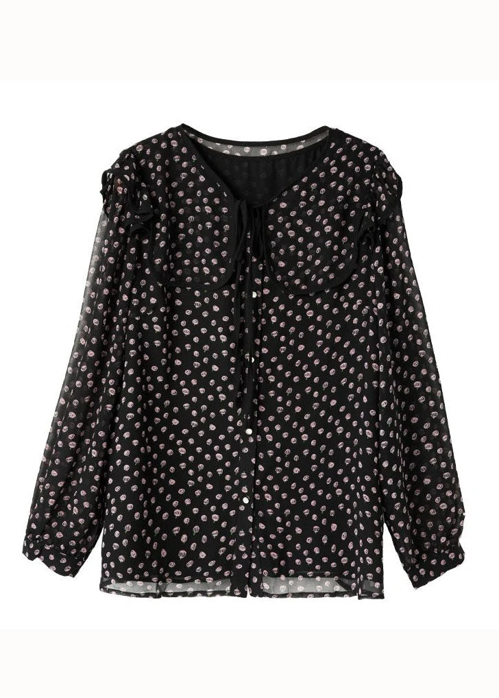 Chic Black Peter Pan Collar Print Patchwork Chiffon Blouse Tops Spring