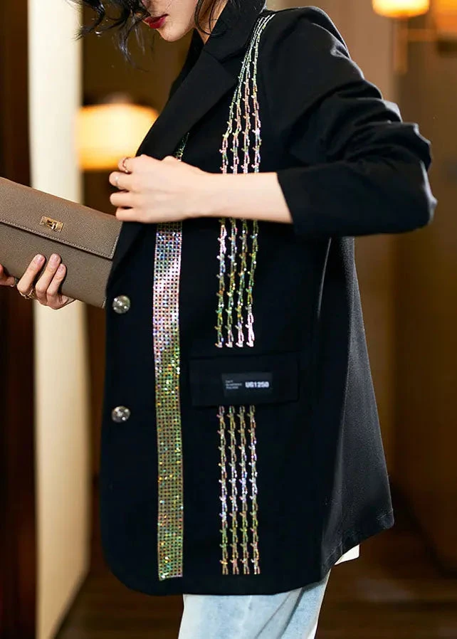 Chic Black Peter Pan Collar Zircon Patchwork Cotton Coat Fall