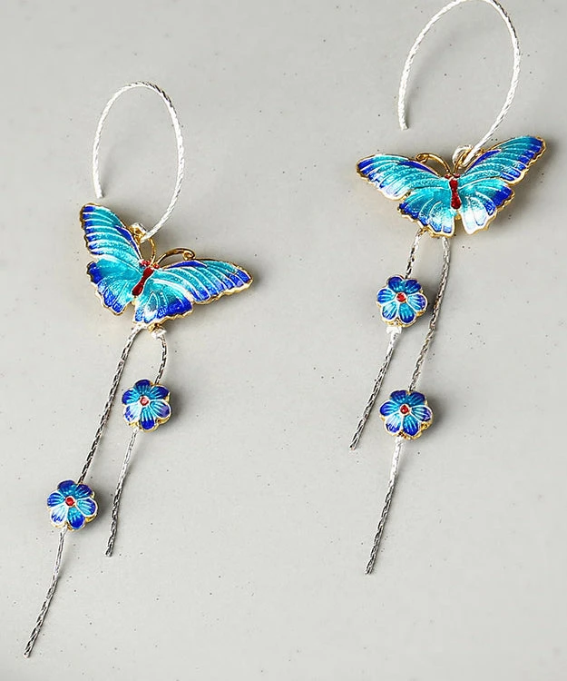 Chic Blue Sterling Silver Cloisonne Butterfly Floral Drop Earrings