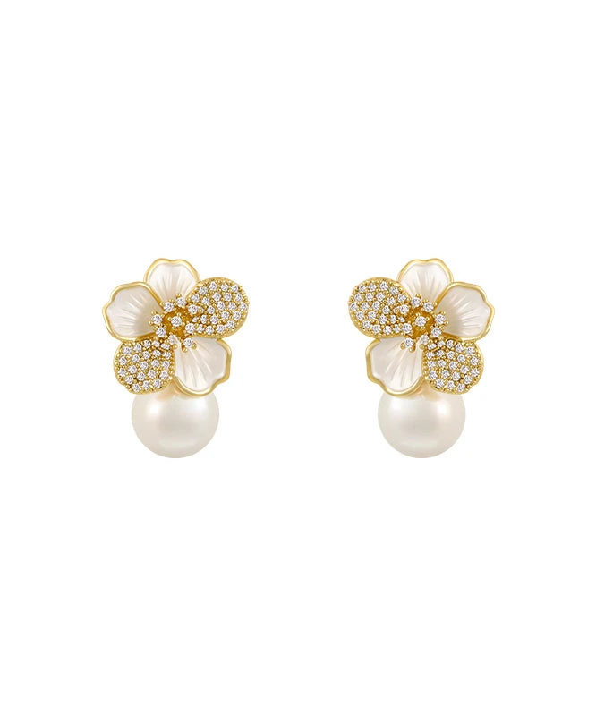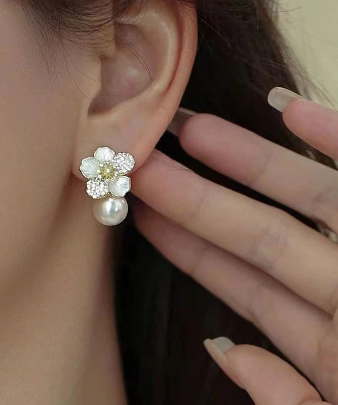 Chic White Sterling Silver Overgild Zircon Pearl Floral Stud Earrings KX1040Â