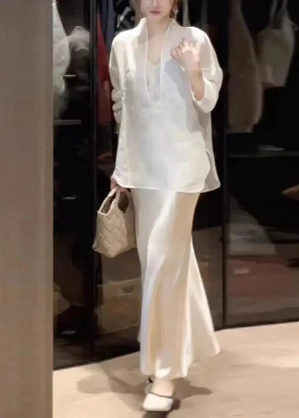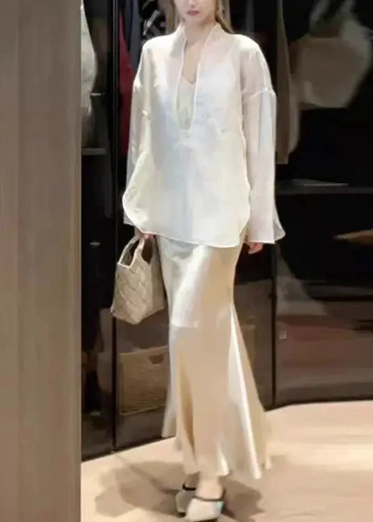 Indulge in luxury with our Chic White Top And Skirts Silk Two Piece Suit. This set offers a cool, comfortable, and gentle feel, perfect for the spring season. Elevate your style with this exclusive and sophisticated suit set.