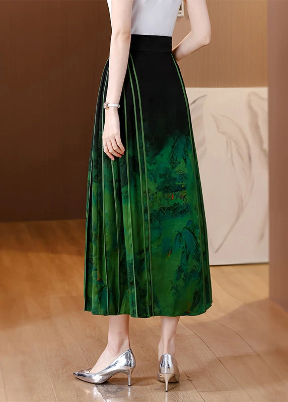 Experience the beauty of Chinese culture with our Blackish Green Wrinkled Print Silk Skirts for the Spring season.