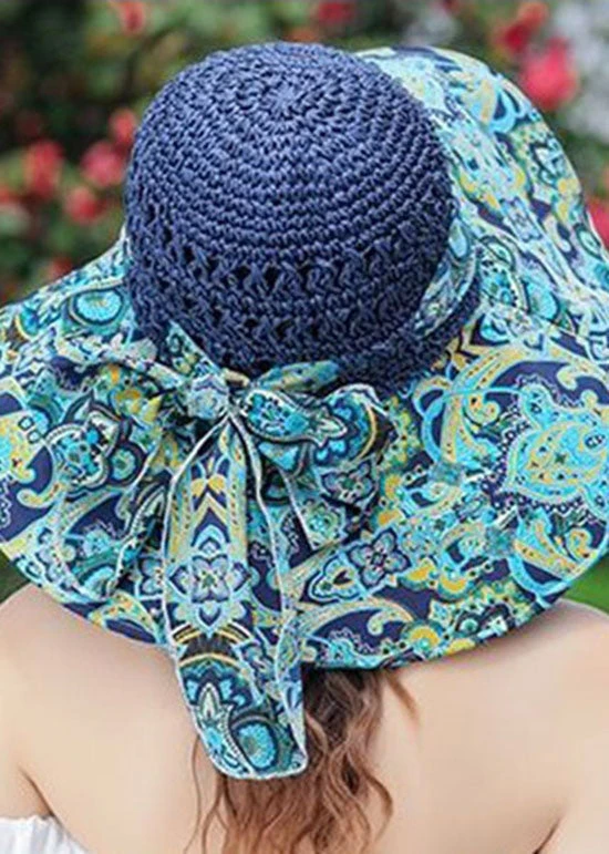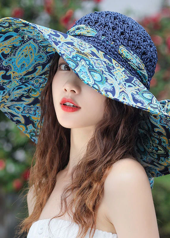 Classy Khaki Bow Print Patchwork Straw Woven Floppy Sun Hat