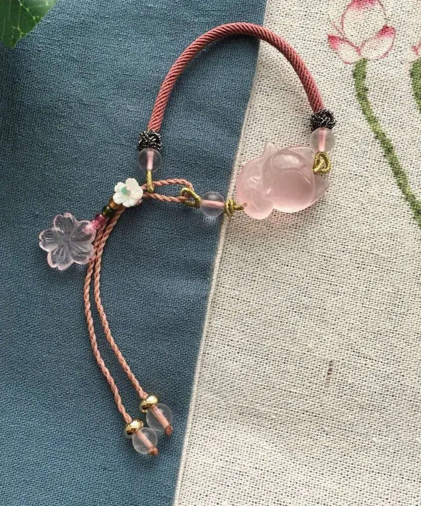 Cute Pink Hand Knitting Crystal Furong Stone Fox Charm Bracelet