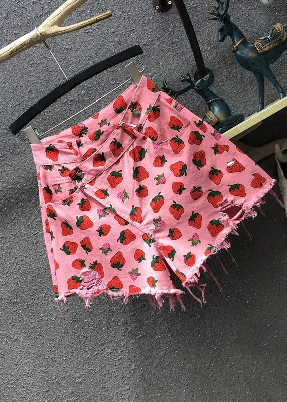 Cute Pink Strawberry Print Pockets Denim Shorts Summer