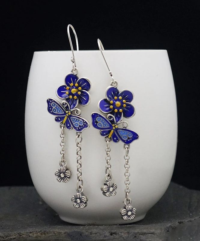 DIY Blue Sterling Silver Butterfly Floral Tassel Drop Earrings