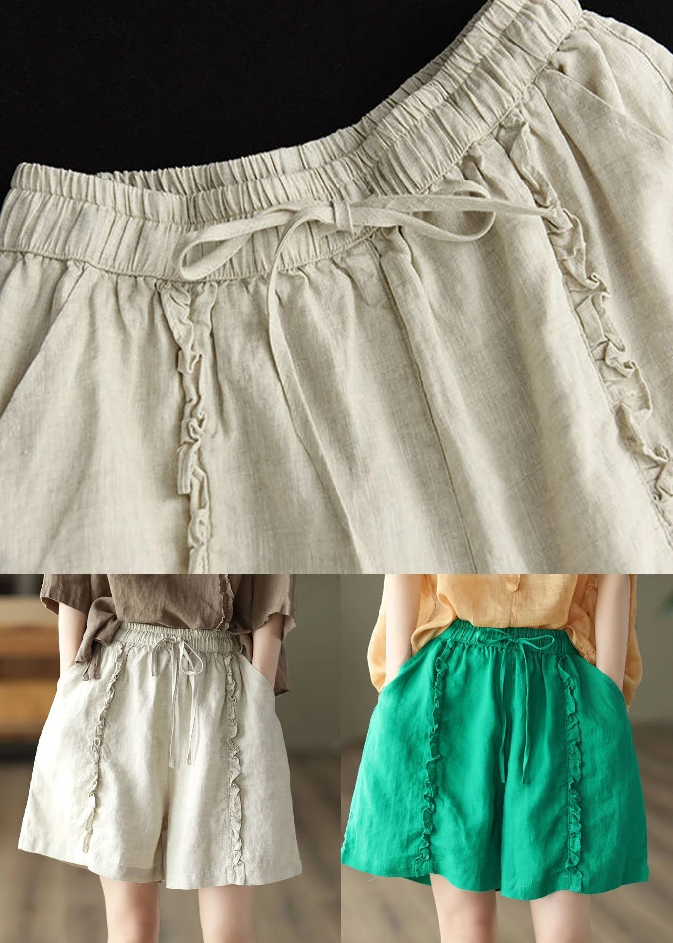 DIY Green Pockets Ruffled Patchwork Linen Hot Pants Summer LY0633