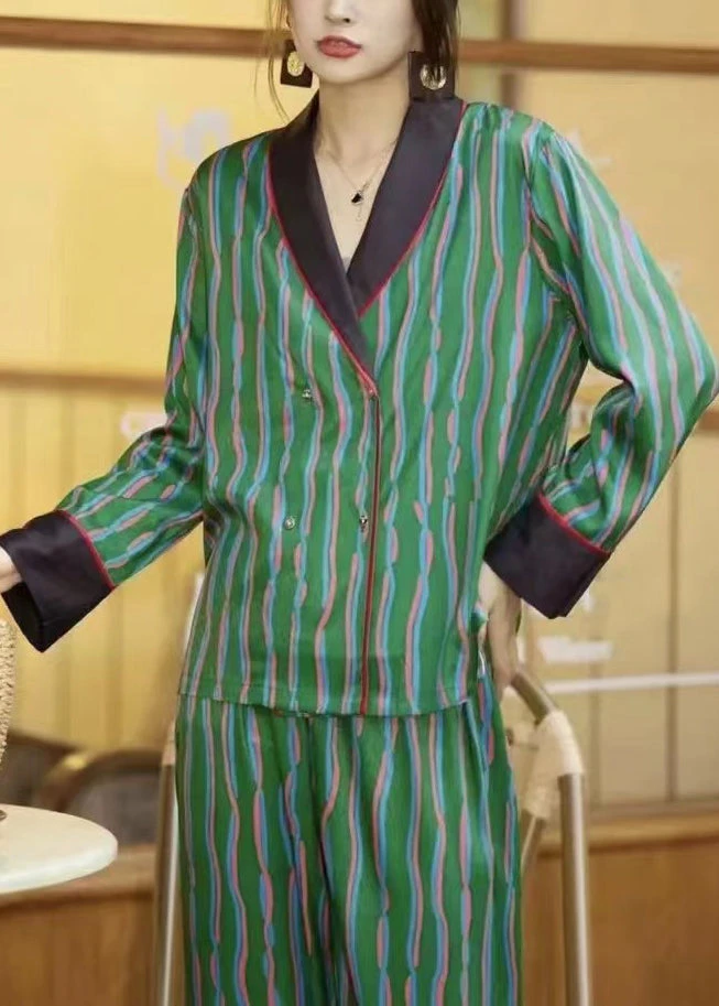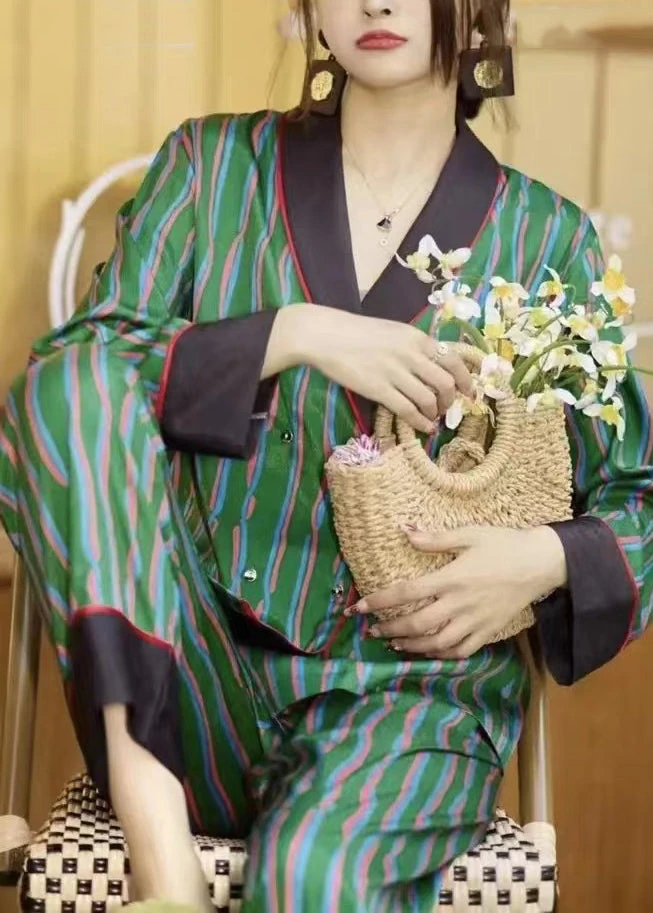DIY Green Striped Peter Pan Collar Ice Silk Pajamas Two Piece Set Long Sleeve