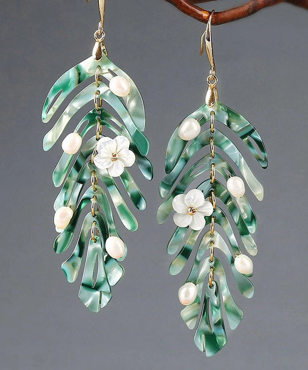 Elegant Green Copper Pearl Shell Flower Asymmetricar Leaf Drop Earrings