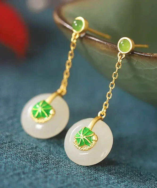 Elegant Green Sterling Silver Overgild Jade Lotus Drop Earrings