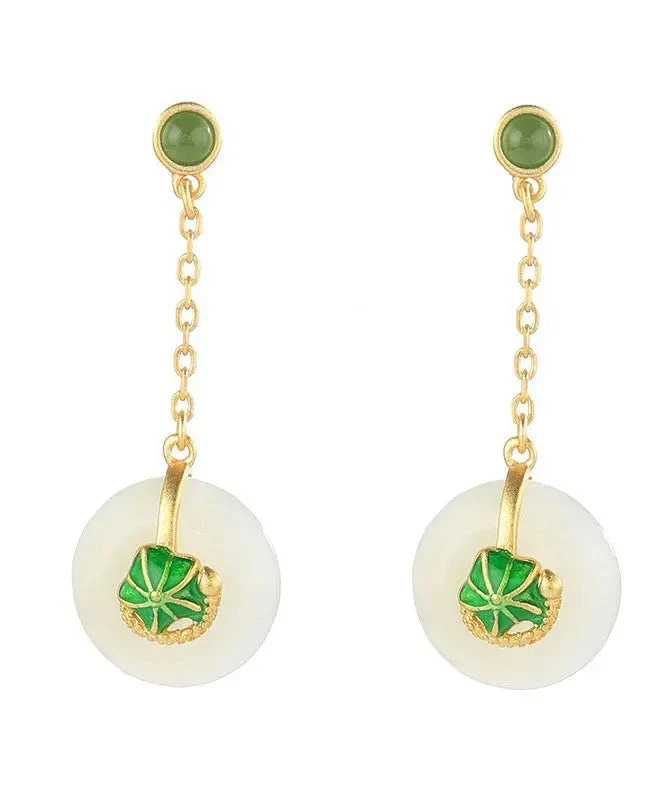 Elegant Green Sterling Silver Overgild Jade Lotus Drop Earrings LY8541