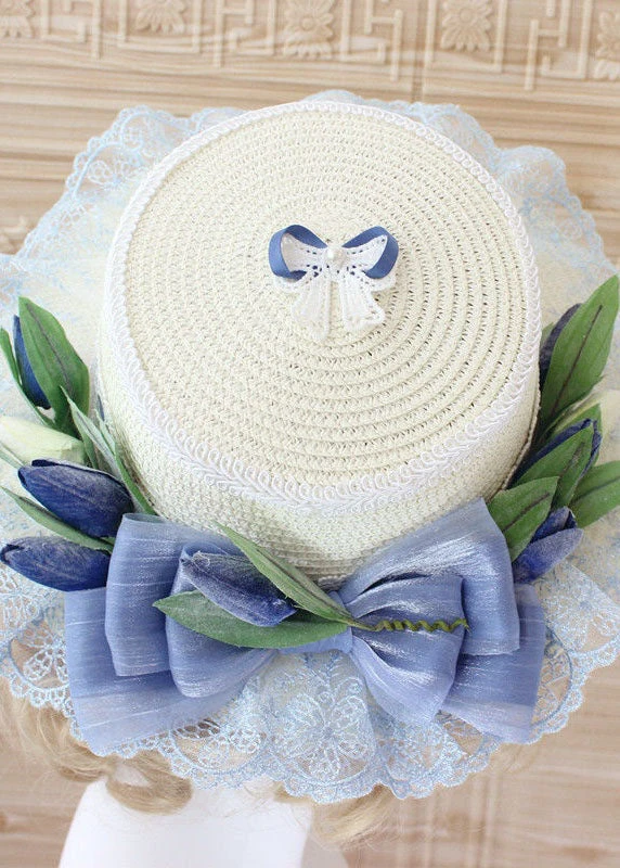 Elegant Pink Bow Lace Patchwork Straw Woven Cloche Hat