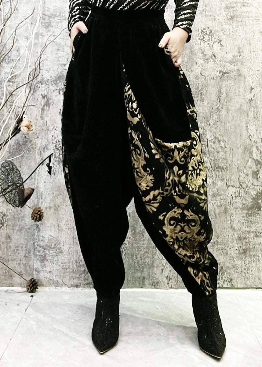 Fashion Black Embroideried Pockets Patchwork Corduroy Lantern Pants Spring
