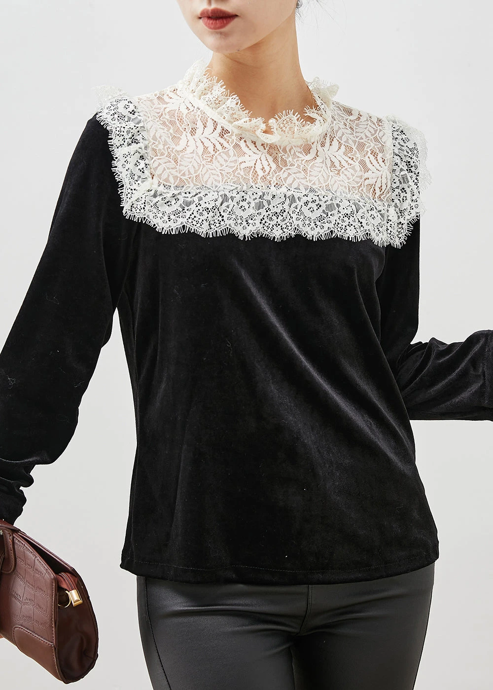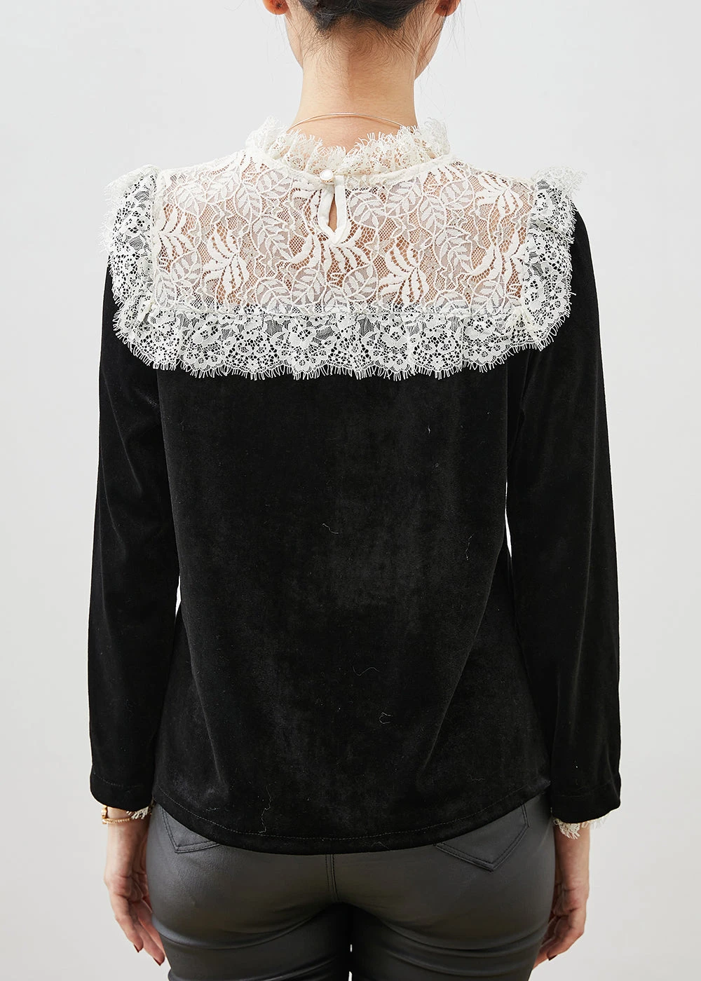 Fitted Black Lace Patchwork Silm Fit Velour Blouses Spring YU1057