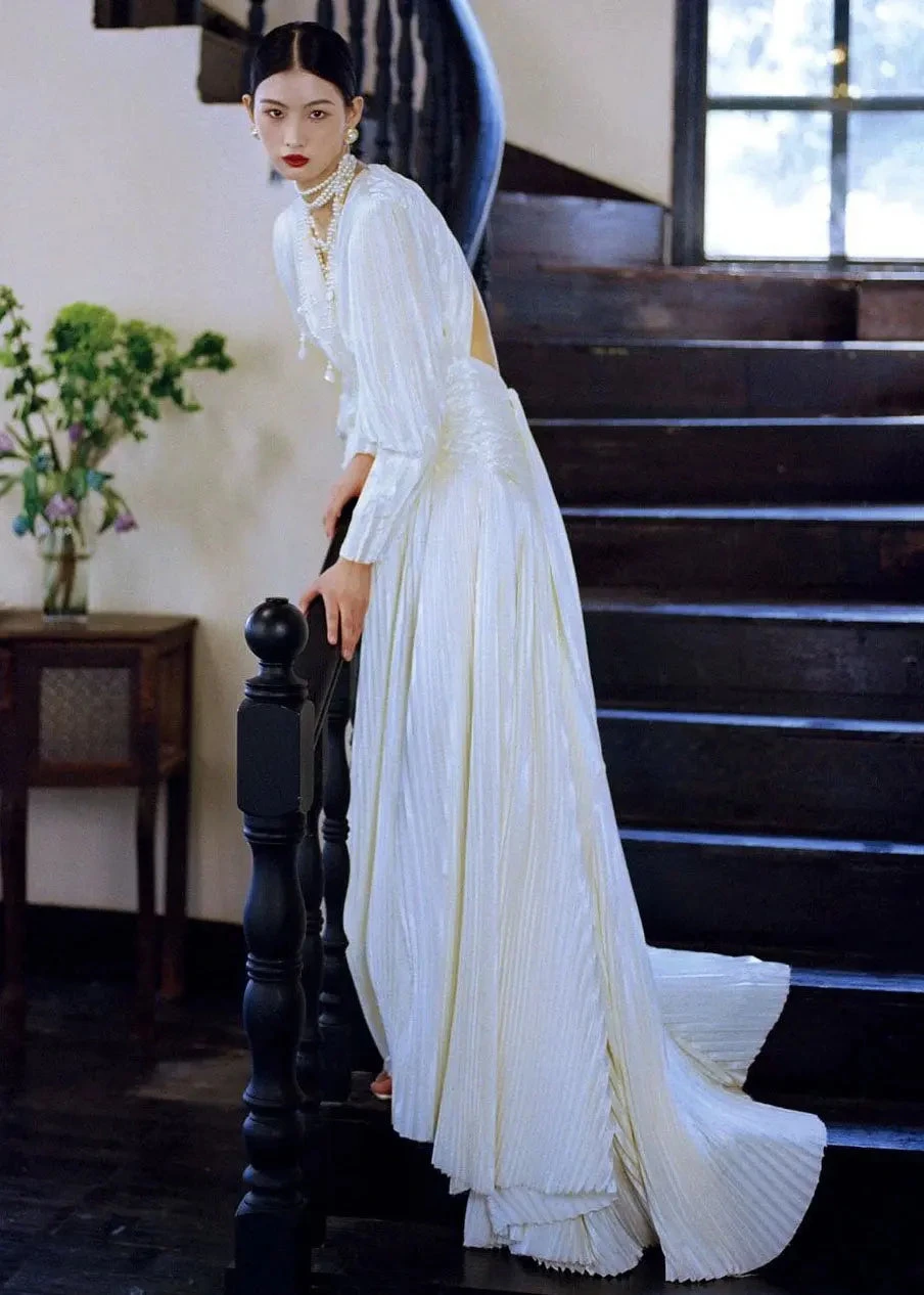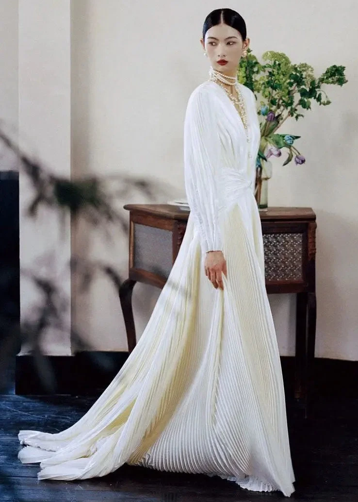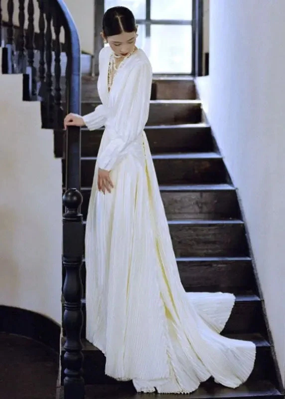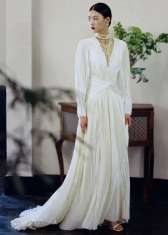 Fitted White V Neck Wrinkled Tunic Vacation Long Dresses Long Sleeve ML3137