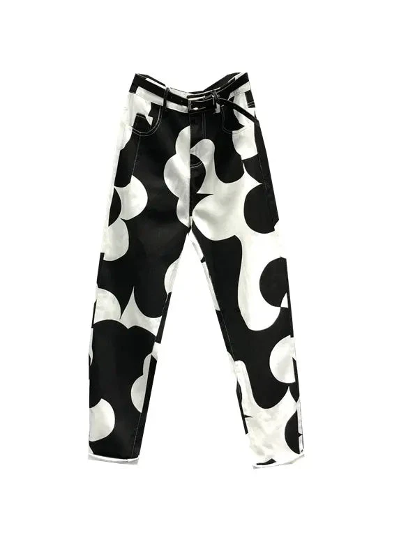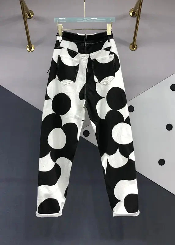 French Asymmetrical Print Pockets Patchwork Denim Pants Fall