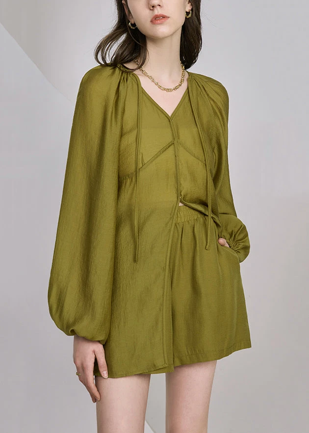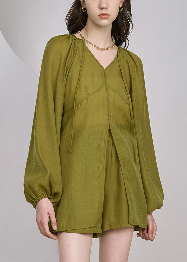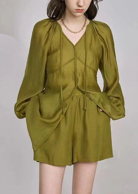 French Grass Green Lace Up Pockets Silk Two Piece Set Long Sleeve