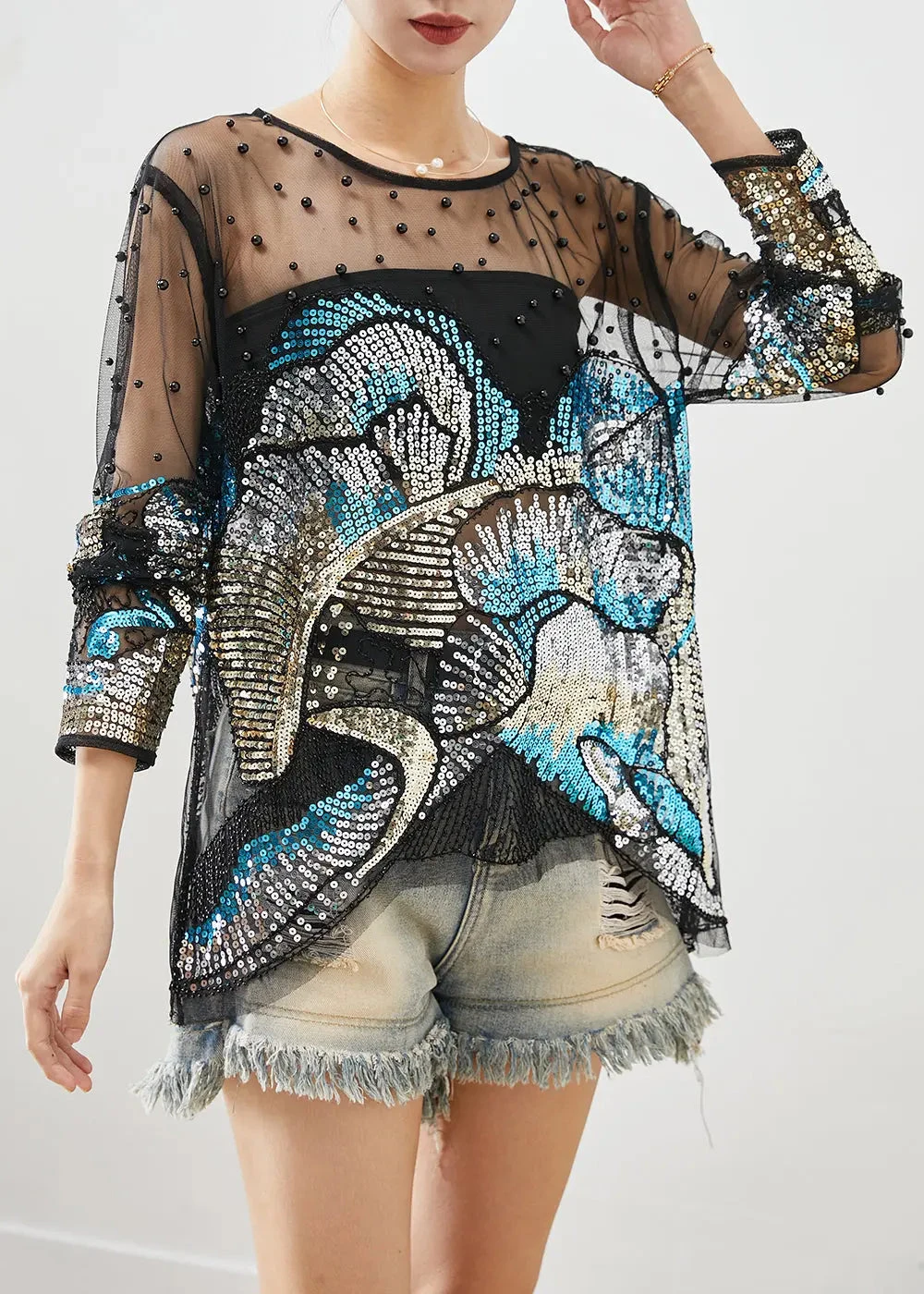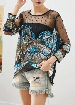 Handmade Black Asymmetrical Sequins Hollow Out Tulle Blouses Fall