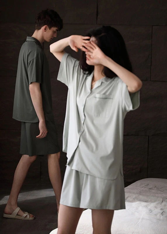 Handmade Light Green Peter Pan Collar Button Cotton Couple Pajamas Two Piece Set Summer