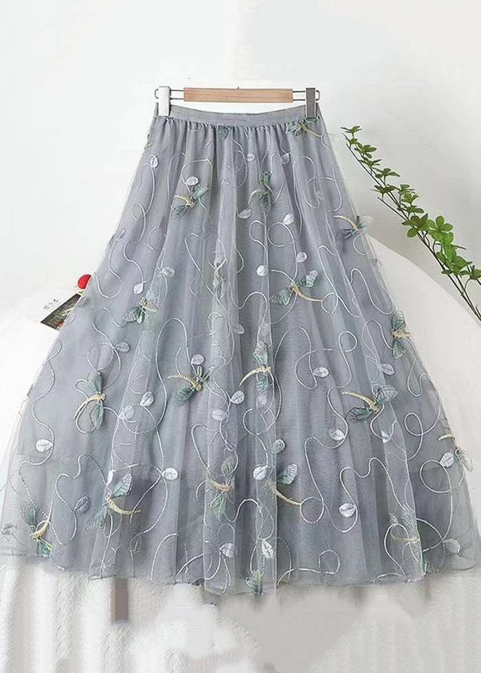Italian Grey Embroidered High Waist Tulle Skirts Spring QQ1035