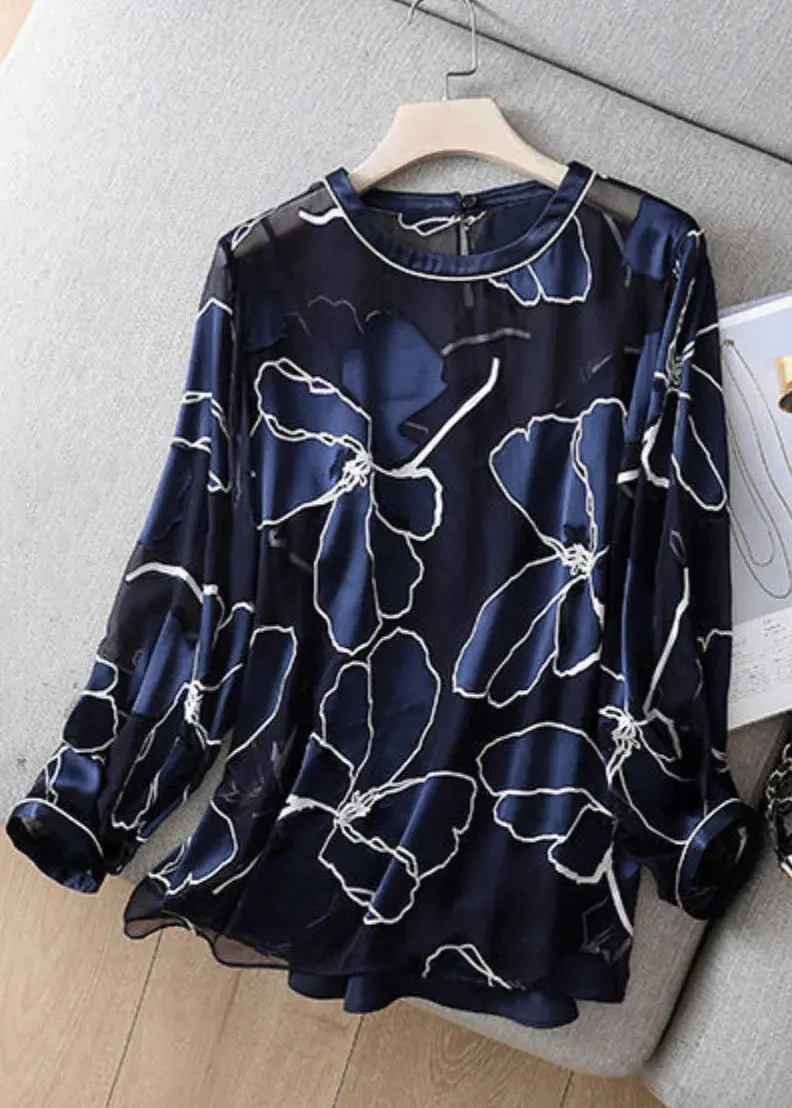 Italian Navy O Neck Print Tulle Patchwork Blouse Top Fall ML2932