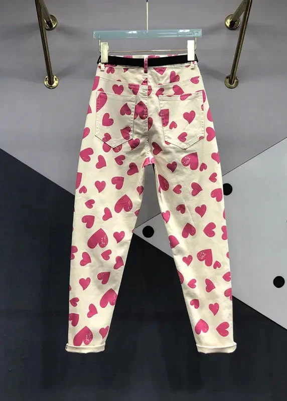 Italian Rose Heart Print Pockets Patchwork Denim Pants Fall