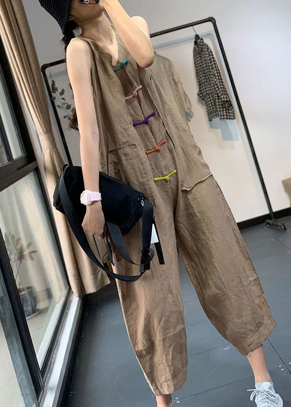 Khaki Pockets Patchwork Linen Jumpsuits Chinese Button SleevelessLY7854