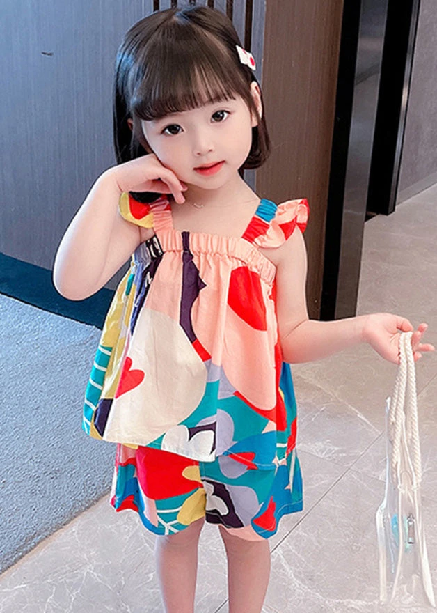 Lovely Slash Neck Print Cotton Girls Top And Shorts Two Pieces Set Summer