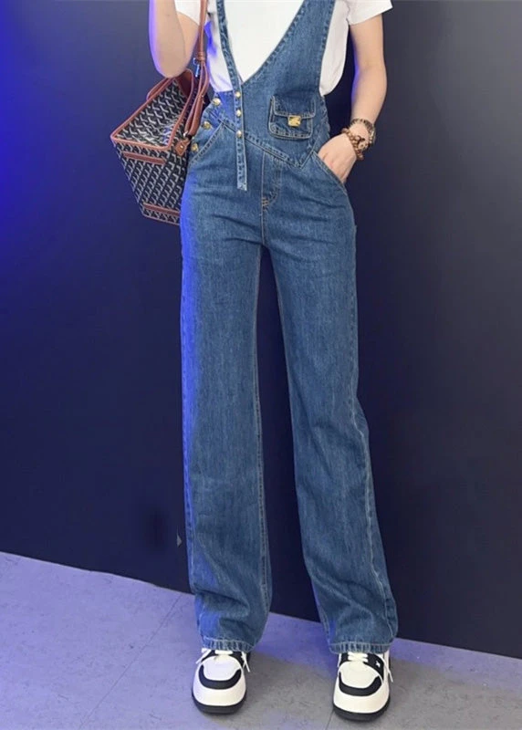 Modern Blue Asymmetrical Patchwork Button High Waist Denim Long Jumpsuits LY5249