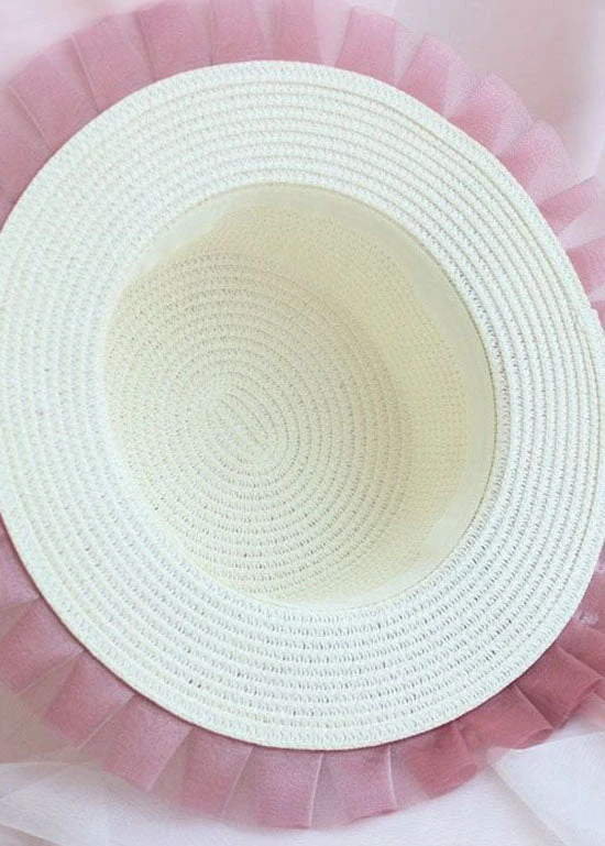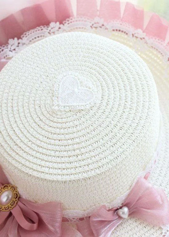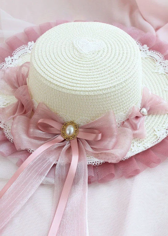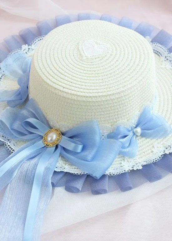 Modern Blue Bow Lace Patchwork Straw Woven Floppy Sun Hat LC0552