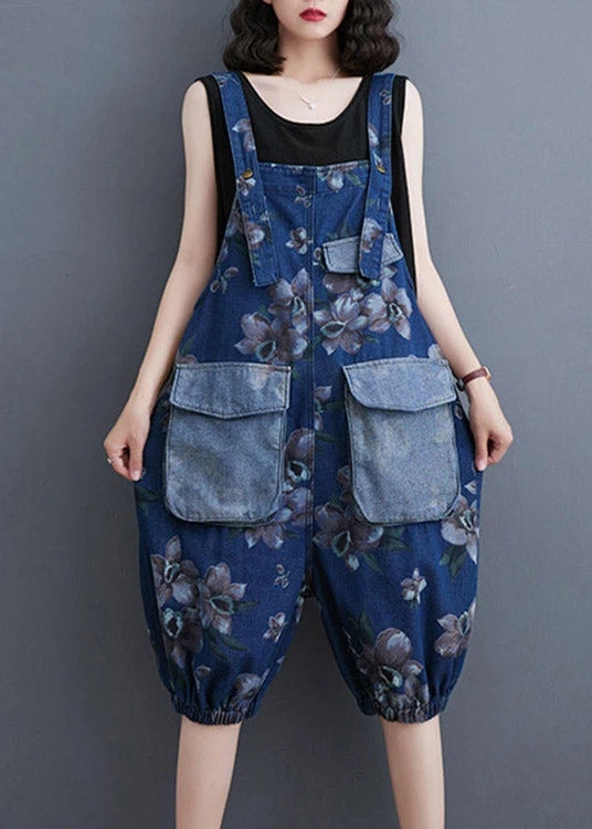 Modern Blue Slash Neck Print Patchwork Button Jumpsuits Summer