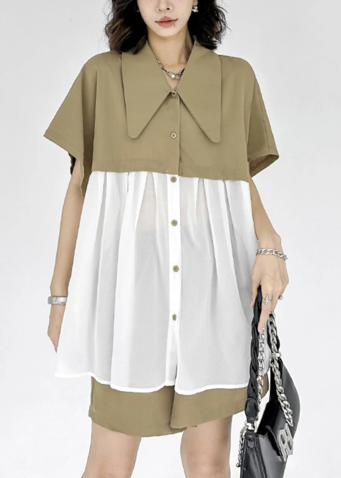 New Khaki Peter Pan Collar Wrinkled Chiffon Patchwork Tops And Shorts Two Pieces Set Summer