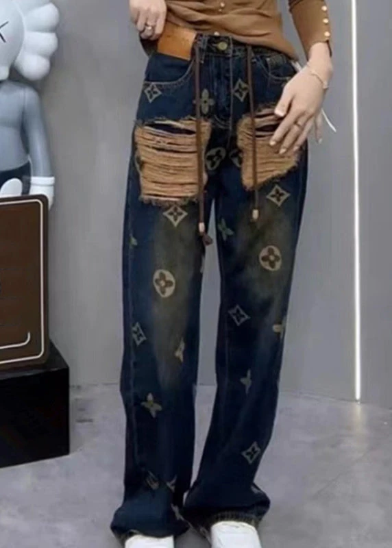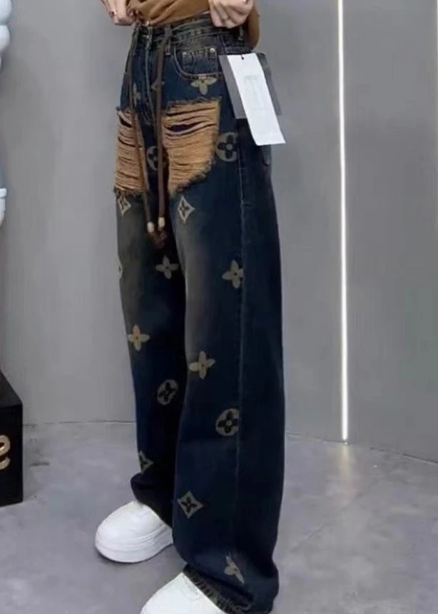 New Ripped Printed Denim Straight Leg Pants For Spring QQ1034