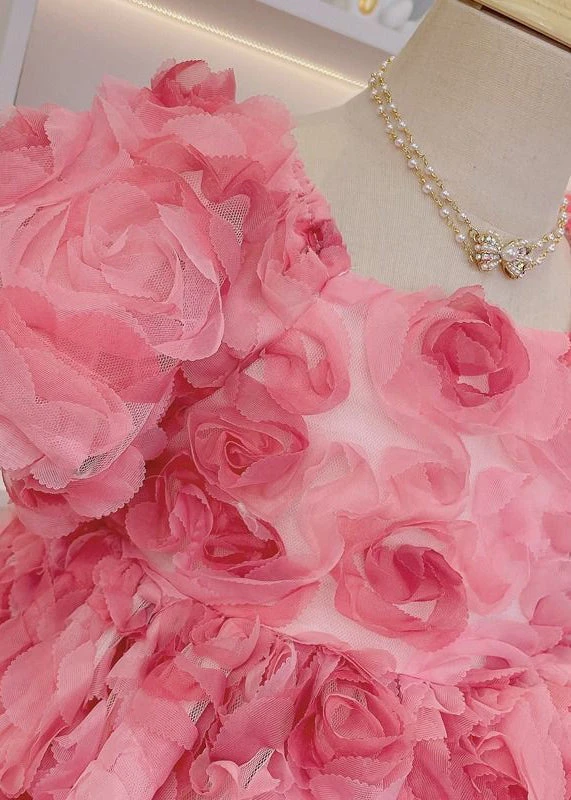 Novelty Pink Square Collar Floral Patchwork Tulle Girls Long Dress Short Sleeve
