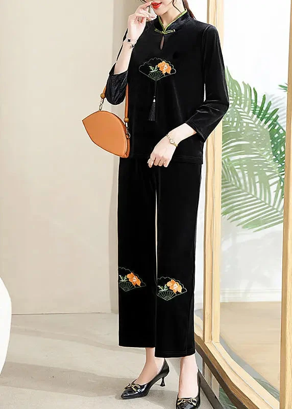Organic Black Embroideried Button Silk Velour Two Piece Set Fall ML0878